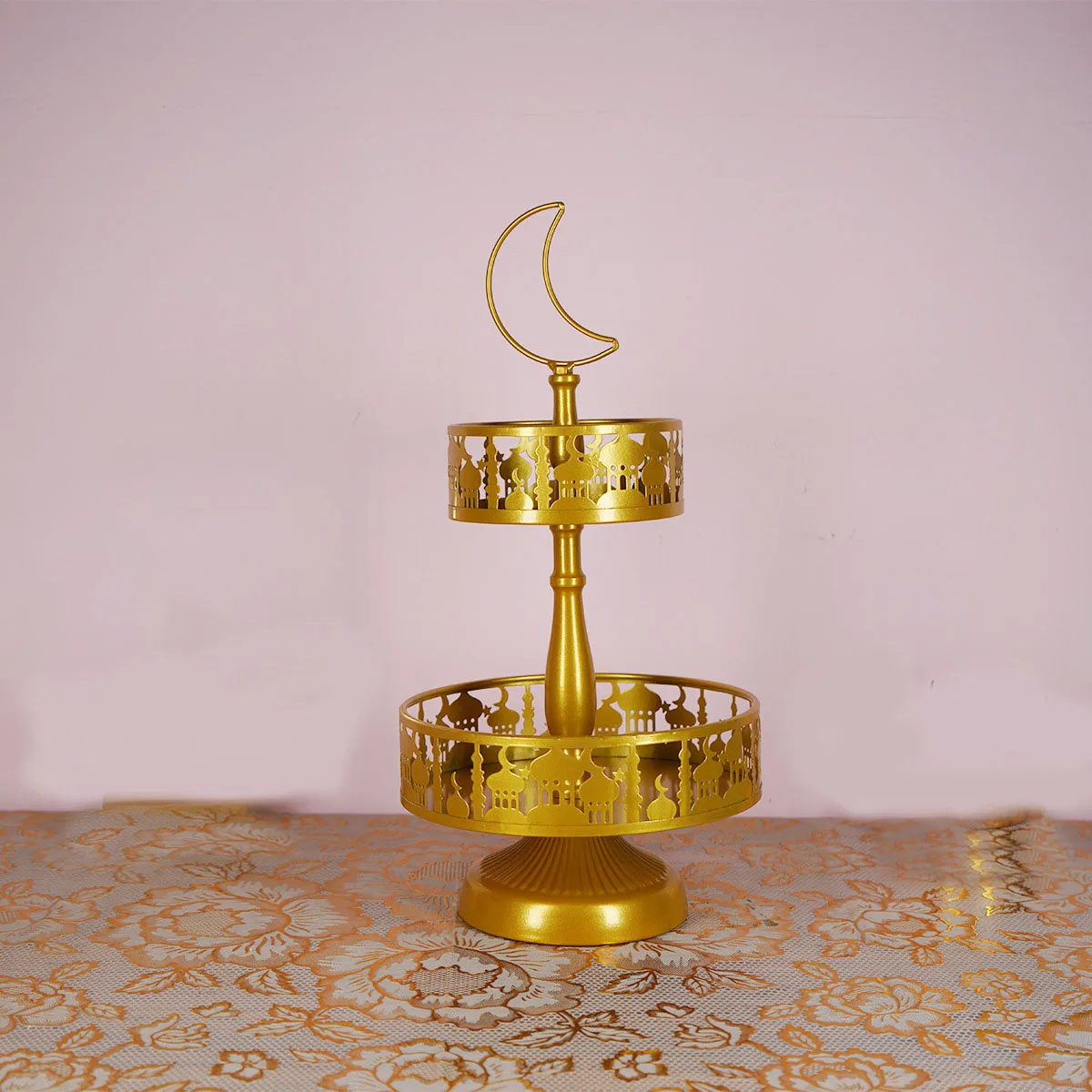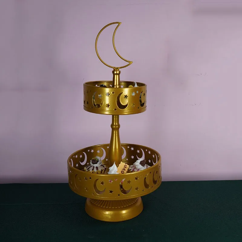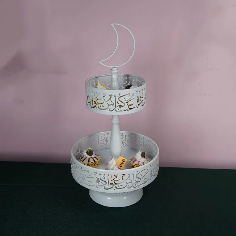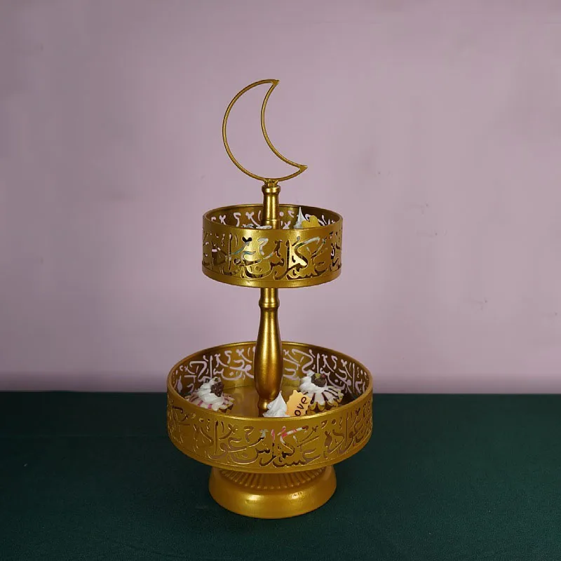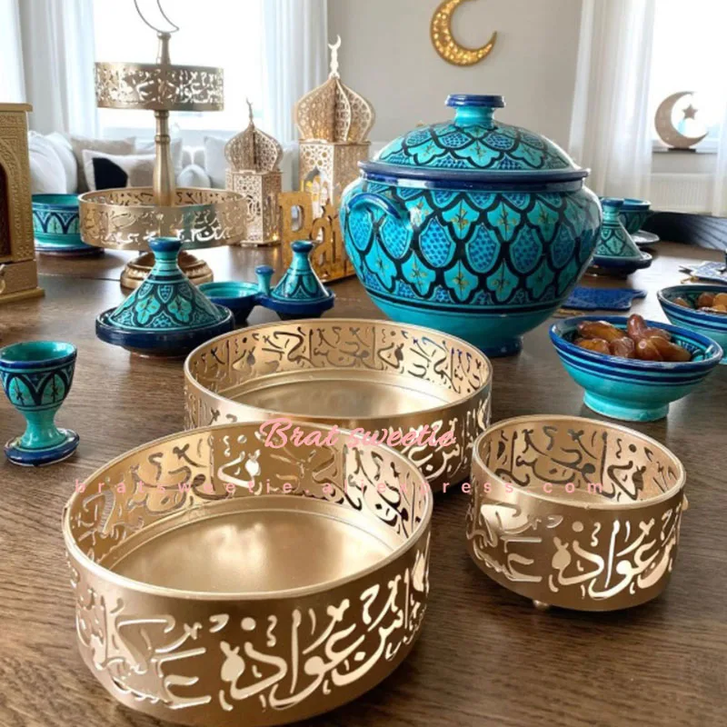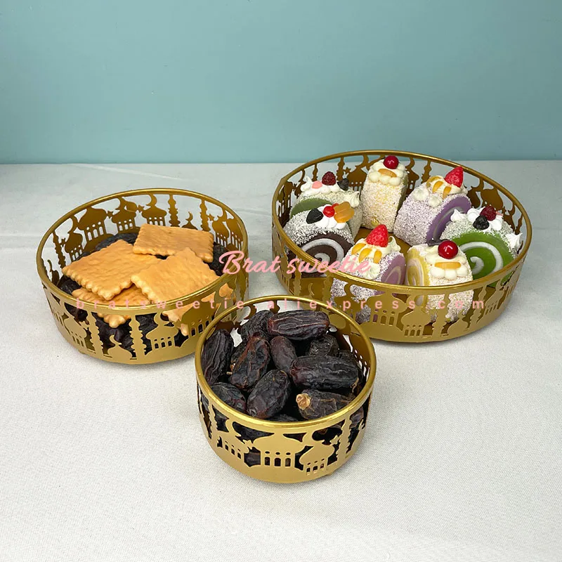 اواني تقديم حلويات احتفل بروح رمضان والعيد مع صواني وحوامل التقديم ذات التصميم الإسلامي الأنيق، والتي تجمع بين القمر والنجمة والمآذن المنقوشة. صممت خصيصًا لإضفاء أجواء رمضانية دافئة وفاخرة على طاولة الضيافة والمناسبات الإسلامية.